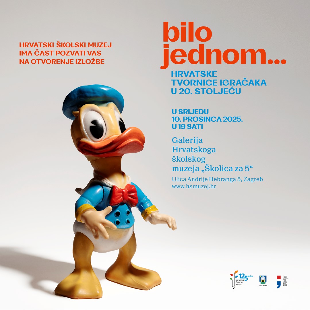Hrvatski školski muzej ima čast pozvati Vas na otvorenje izložbe „Bilo jednom... hrvatske tvornice igračaka u 20. stoljeću“, autorice Sanje Nekić, više kustosice muzeja, koje će se održati u srijedu 10. prosinca 2025. u 19 sati u galeriji muzeja „Školica za 5“ u Hebrangovoj 5 u Zagrebu.