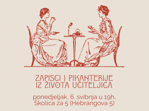 Pozivamo vas da u ponedjeljak, 6. svibnja u 19 sati dođete u galeriju Hrvatskog školskog muzeja "Školica za 5", u Hebrangovu 5, na neformalni razgovor “Zapisci i pikanterije iz života učiteljica” na kojem će vas istraživačice na projektu – Lana Perišić, Paula Ćaćić i Tihana Bertek odvesti iza kulisa izložbe "Od vlastite učionice do vlastite sobe" te ćete imati ekskluzivnu priliku saznati manje poznate zanimljivosti iz života učiteljica, kao i zapise njihovih suvremenika vezane uz ulogu žene u društvu. Saznat ćete i kako je izgledao sam proces istraživanja i koji su izazovi istraživanja ženske povijesti.